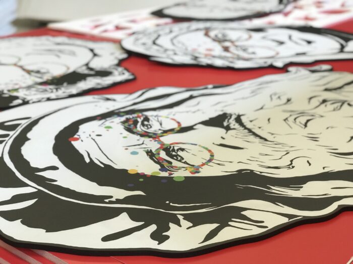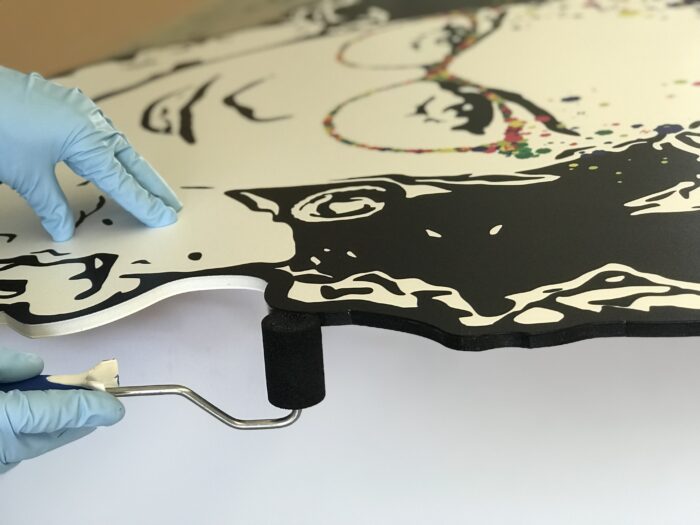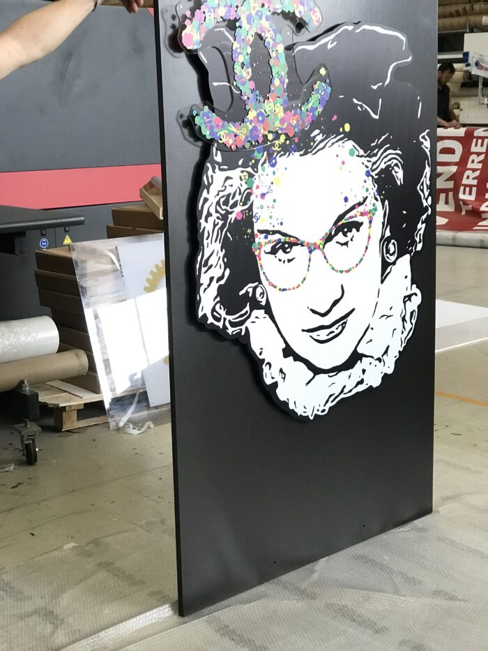 I materiali della mostra hanno comportato lavorazioni e precisione, come sempre in questi casi. Nello specifico si tratta di stampa su supporto sagomato, con inserto in plexi sagomato e rifiniture a mano.